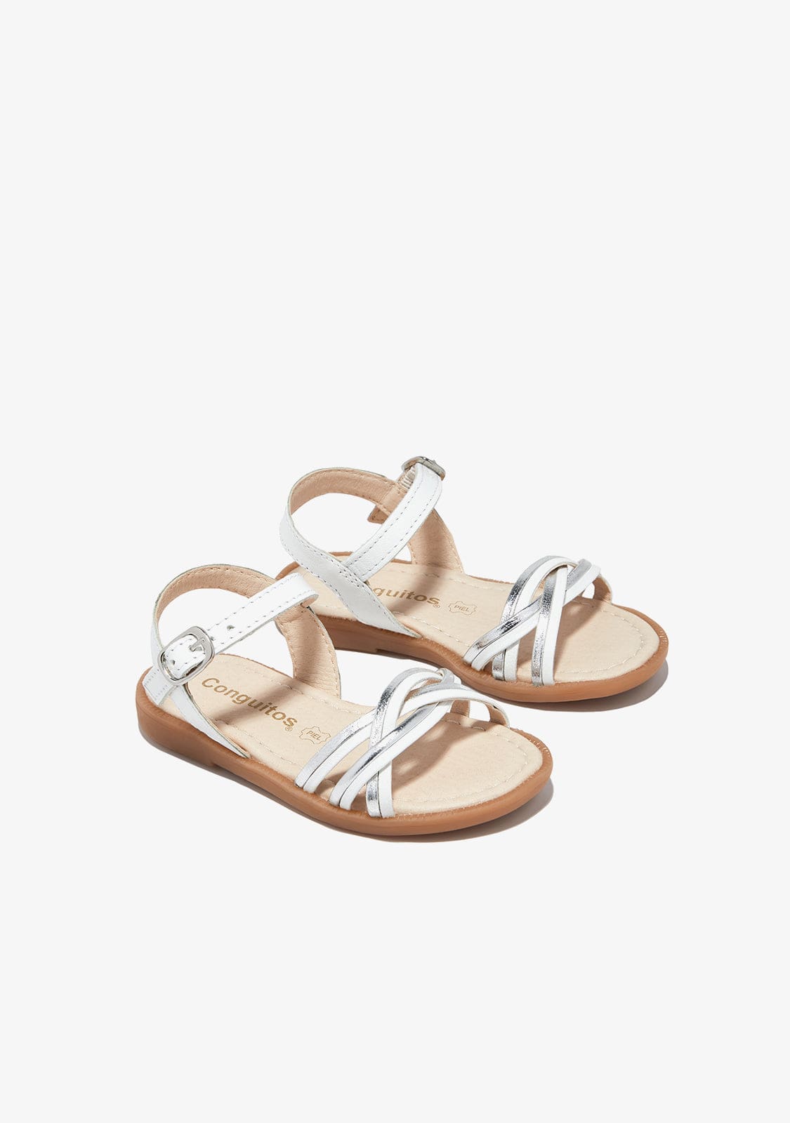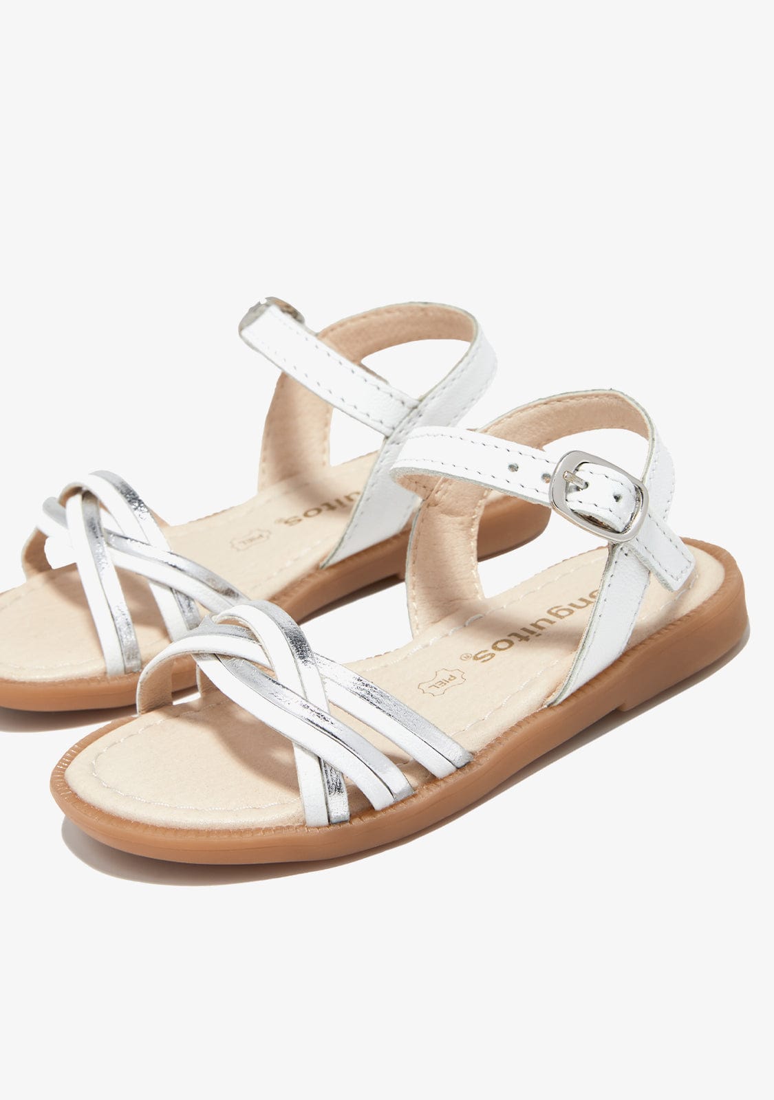 These sandals are designed in nappa leather. They have white and silver straps on the front.