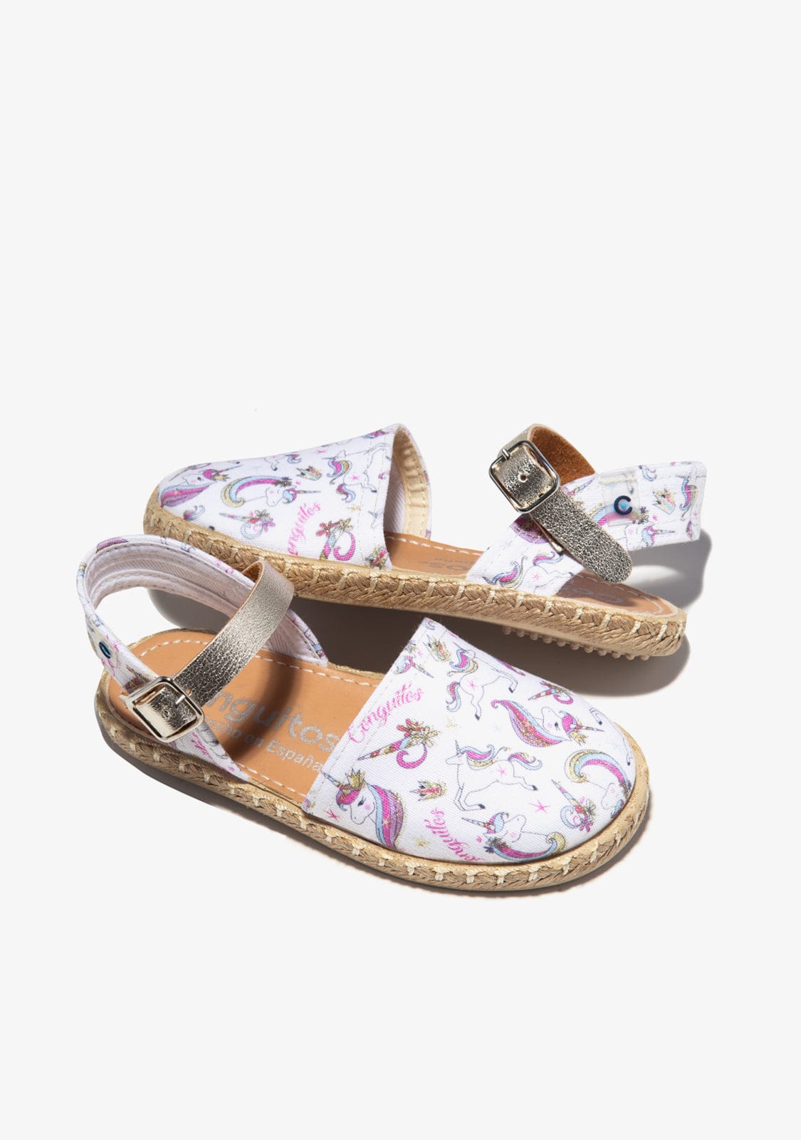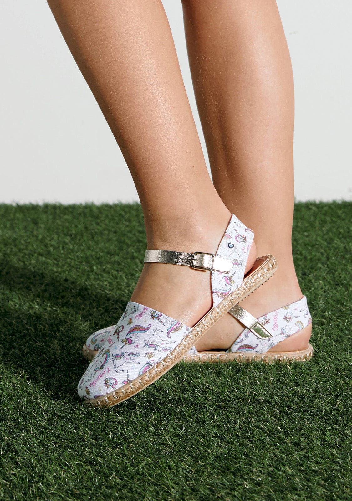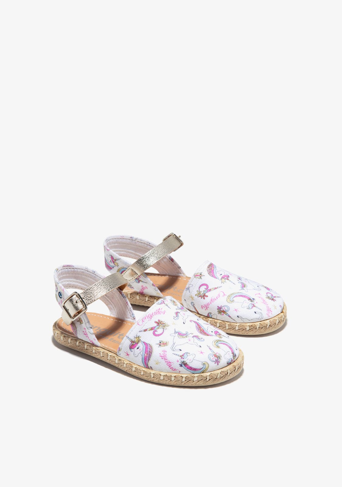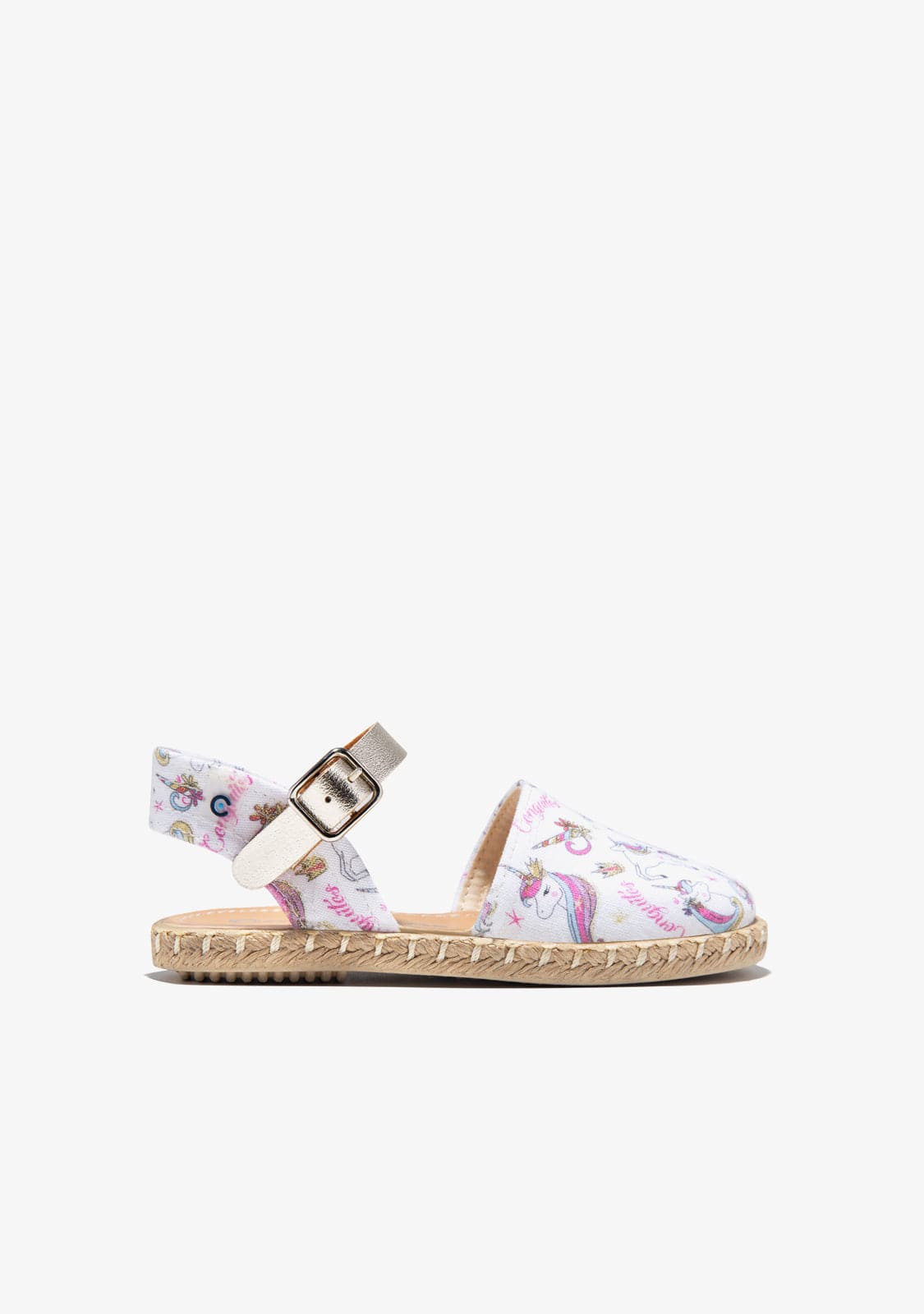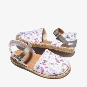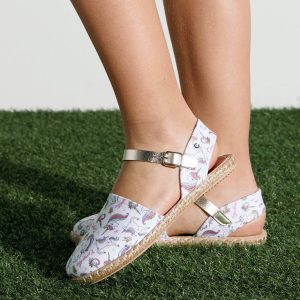 Cotton espadrilles with unicorn print. They have a closed front and white fabric with unicorn print. They have a silver bracelet with a buckle for a better fastening to the foot.