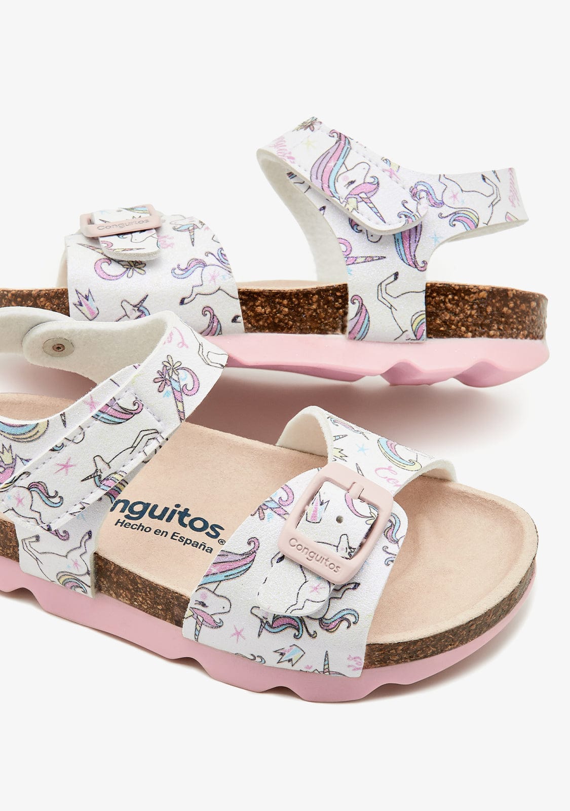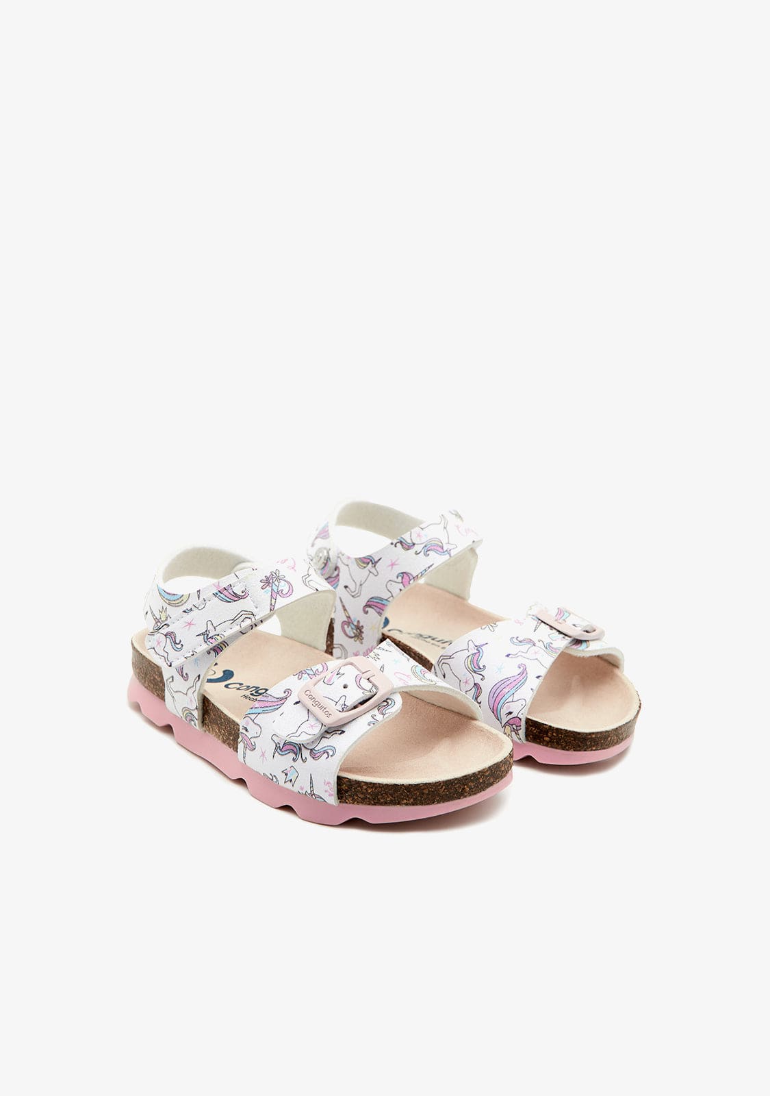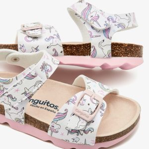 This sandal model has a buckle on the front strap and has a strap fastening for greater comfort. The sandals are white, have unicorn prints and pink details.