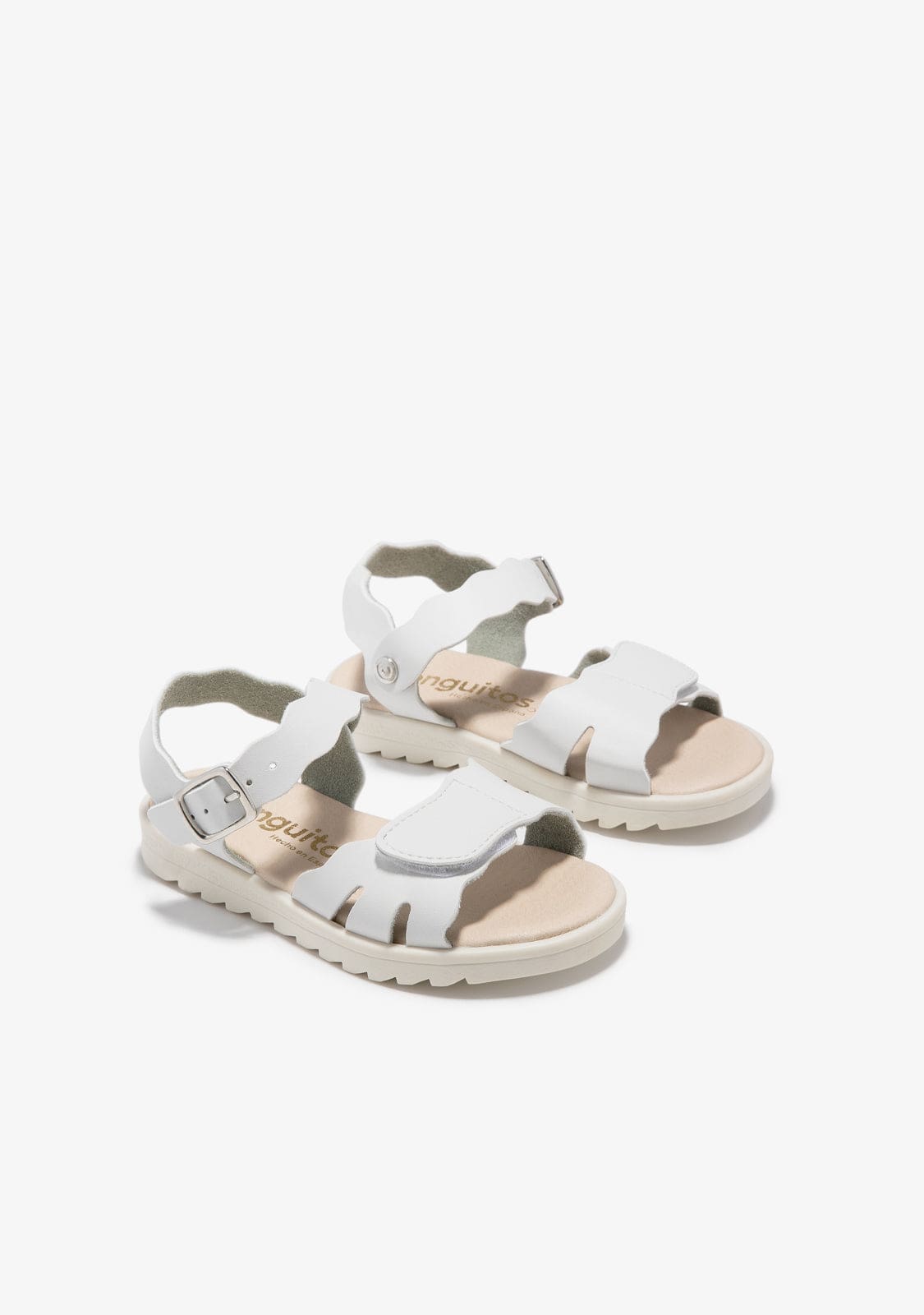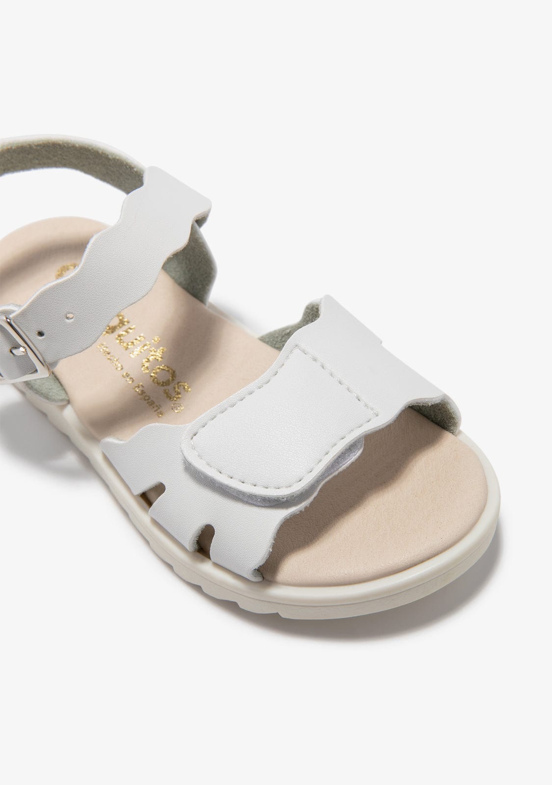 This white model has a metal buckle fastening and an adherent strap for greater comfort and resistance. They are designed in white and have the edges in the shape of waves.