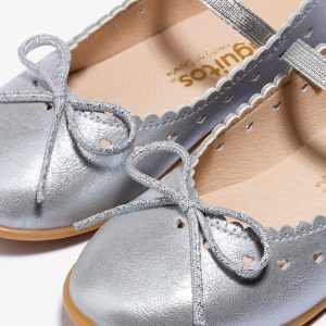 Silver ballerinas, created to fill all the little ones’ events with sparkle. These ballerinas are decorated with a bow and a delicate heart-shaped die-cut around the edge, as well as a wave-shaped outline. This model has an elasticated strap on the instep for better foot support. In addition, they have a breathable textile